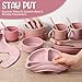 - Silicone Baby Feeding Set: the package comes with 24 sets of silicone baby feeding set in 3 different colors of dark pink, dusty pink, peach color, 8 pieces per set, and each set contains a suction divided plate, a pair of spoons and forks, an adjustable silicone bib, a complementary food bowl, a snack cup, a silicone spoon, and a straw, which covers the basic utensils for baby food, helping your baby transition to self eating