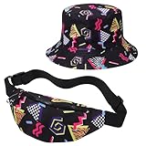 2 Pcs 80s 90s Fanny Pack Bucket Hat Waist Bag 80s 90s Outfit Retro Summer Sports Party Fashion Accessories for Men Women (Black)