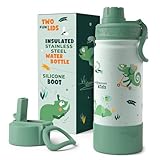 Bentoheaven Kids Water Bottle Stainless Steel for Boys & Girls, 2 Lids (Chug & Straw), Handle & Silicone Boot, Reusable Metal Leak-proof Insulated Tumbler, School & Sports 17oz (Green)