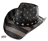 American Flag Country Distressed Tea Stain Star Cowboy Hat, USA Vintage. Take this hat to a festival, concert, lake, party, fishing on the boat or anywhere you want to show your pride for your great nation. It features a stained band of stars around the crown with stars. The stained red and white stripes are on the brim.
