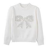 Danny D Young Girl′s Bowknot Sequin Knitted Sweater Crew Neck Long Sleeved Tops for Autumn and Winter (US, Age, 7 Years, 8 Years, White)