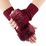 GLV119-Burgundy Warm Cable Knit Winter Fingerless Gloves arm warmers with Faux Fur Trim