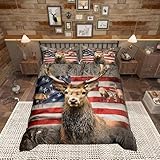 Wild Deer Boys Duvet Cover Queen Size, Rustic Animal Deer Antler Tree Branch Nature Bedding Set for Men Adult, Stripes Red Blue USA Flag Print Polyester Quilt Cover with 2 Pillowcases (No Comforter)