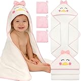 Flasoo 4 PCS Baby Towels Set, Soft Baby Towels and Washcloths Set, 1 Hooded Baby Towel and 3 Baby Washcloths for Newborns, Toddlers, and Kids, 32x32 Baby Towel with Hood for Boy and Girl (Pink Duck)