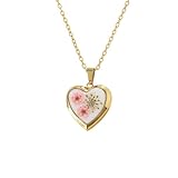 Heart Locket Dried Flower Pendant Necklace Stainless Steel Gold Plated Cute Light Pink Pressed Wildflower Charm Holds Pictures Choker Necklaces Fashion Trendy Jewelry for Her Bff 17.5"