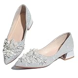 Women's Rhinestone Fashion Pointed Toe Pearl Diamond Low Heel Dress Wedding Work Business Dance Pumps 2Silver Size 7