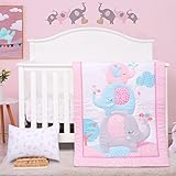 JISEN 3 Piece Crib Bedding Set Crib Quilt Crib Sheet Pillowcase - Soft Microfiber Printed Nursery Set for Baby Boys or Girls Pink Elephant