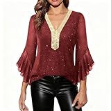 Women's V Neck Flare Sleeve Shirts Dressy Sparkly Tunic Tops Flowy Ruffle 3/4 Bell Sleeves Blouses for Party Wear(Wine,X-Large)