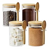 Glass Sugar Container with Spoon - 4 Pack 15oz Glass Jars with Bamboo Lid and Spoon, Bamboo Lid Storage Jar Containers for Coffee Beans, Spice, Brown Sugar, Tea, Flour, Nuts, Candy, Salts and More
