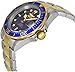 Bold styling combines with a classic design in this automatic watch #8928 from Invicta's Pro Diver collection. This sporty yet refined timepiece features a two-tone gold-plated and silver-tone stainless steel case, bezel, and bracelet strap. Protected by an anti-reflective mineral crystal with magnifier, a vivid blue dial showcases easy-to-read hands and markers, as well as a date display at three o'clock. Automatic 21-jewel movement is both shock resistant and reliable, while water resistance to 200 meters (660 feet) helps guard against the elements.<p><b>Pro Diver Collection</b></p><p> Plunge into any horizon using the steadfast guidance of the Invicta Pro Diver. Stylishly classic, internal workings are forged with variations of either Swiss chronograph or 21-jewel automatic movements and willingly navigate in depths up to 300 meters. Built with confident prowess, the fortitude with which these timepieces function makes the Pro Diver the quintessential in performance.</p><p><i><b>Screw Down Crowns:</b></i> Many Invicta watches are equipped with a screw down crown to help prevent water infiltration. This is most common on our Diver models. In order to adjust the date and/or time on such a watch, you must first unscrew the crown before you can gently pull it out to its first or second click stop position. To do this, simply rotate the crown counterclockwise until it springs open. When you have finished setting the watch, the crown must then be pushed in and screwed back in tightly. <b>Not doing so will cancel the water resistance of the watch and will void all warranties from the manufacturer.</b> Overall, this process should not require a lot of effort or force.</p><p><em><strong>Automatic Watches</strong></em><br><br><strong>Automatic watches do<em> </em>not operate on batteries.</strong> Automatic watches are made up of about 130 or more parts that work together to tell time. Automatic movements mark the passage of time by a series of gear mechanisms, and are wound by the movement of your wrist as you wear it. The gear train then transmits the power to the escapement, which distributes the impulses, turning the balance wheel. The balance wheel is the time regulating organ of a mechanical watch, which vibrates on a spiral hairspring. Lengthening or shortening the balance spring makes the balance wheel go faster or slower to advance or retard the watch. The travel of the balance wheel from one extreme to the other and back again is called oscillation. Lastly, automatic movements come in different types, including movements that are Swiss-made, Japanese-made, and more.<br><br>Also referred to as self-winding, watches with automatic movements utilize kinetic energy, the swinging of your arm, to provide energy to an oscillating rotor to keep the watch ticking. They're considered more satisfying to watch collectors (horologists) because of the engineering artistry that goes into the hundreds of parts that make up the movement. If you do not wear an automatic watch consistently (for about 8 to 12 hours a day), you can keep the watch powered with a watch winder (a great gift for collectors).<br></p>