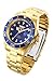 With the affordable gold-tone Invicta Pro Diver automatic men's watch, you can still afford to buy flippers and a pair of goggles. It features a shock-resistant, 21-jewel automatic movement that will stand up to the rigors of your undersea adventures, and it's water resistant to 660 feet. The watch case and stainless steel bracelet band are both plated with 23 karat yellow gold, and mix brushed and polished finishes. The navy blue dial includes large Tritnite luminous markers and hands, and a date window at 3 o'clock with a magnifier. Other features include a unidirectional rotating bezel with elapsed time markings, fold-over clasp with safety, and a durable mineral crystal.<p><strong>Pro Diver Collection</strong></p><p><em><strong>Automatic Watches</strong></em><br /><br /><strong>Automatic watches do<em> </em>not operate on batteries.</strong> Automatic watches are made up of about 130 or more parts that work together to tell time. Automatic movements mark the passage of time by a series of gear mechanisms, and are wound by the movement of your wrist as you wear it. The gear train then transmits the power to the escapement, which distributes the impulses, turning the balance wheel. The balance wheel is the time regulating organ of a mechanical watch, which vibrates on a spiral hairspring. Lengthening or shortening the balance spring makes the balance wheel go faster or slower to advance or retard the watch. The travel of the balance wheel from one extreme to the other and back again is called oscillation. Lastly, automatic movements come in different types, including movements that are Swiss-made, Japanese-made, and more.<br /><br />Also referred to as self-winding, watches with automatic movements utilize kinetic energy, the swinging of your arm, to provide energy to an oscillating rotor to keep the watch ticking. They're considered more satisfying to watch collectors (horologists) because of the engineering artistry that goes into the hundreds of parts that make up the movement. If you do not wear an automatic watch consistently (for about 8 to 12 hours a day), you can keep the watch powered with a watch winder (a great gift for collectors).<br /></p> <p>Plunge into any horizon using the steadfast guidance of the Invicta Pro Diver. Stylishly classic, internal workings are forged with variations of either Swiss chronograph or 21-jewel automatic movements and willingly navigate in depths up to 300 meters. Built with confident prowess, the fortitude with which these timepieces function makes the Pro Diver the quintessential in performance.</p> <p><em><strong>Screw Down Crowns:</strong></em><strong></strong> Many Invicta watches are equipped with a screw down crown to help prevent water infiltration. This is most common on our Diver models. In order to adjust the date and/or time on such a watch, you must first unscrew the crown before you can gently pull it out to its first or second click stop position. To do this, simply rotate the crown counterclockwise until it springs open. When you have finished setting the watch, the crown must then be pushed in and screwed back in tightly. <strong>Not doing so will cancel the water resistance of the watch and will void all warranties from the manufacturer.</strong> Overall, this process should not require a lot of effort or force.</p>