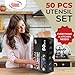 - Complete 50Pcs Set: The Kaluns utensil set includes everything you need for a complete cooking experience. You’ll receive: slotted turner, ladle, salad spoon, solid turner, solid spoon, pasta server, slotted spoon, skimmer, spatula, utensil rest, can opener, egg separator, small spatula, spatula spoon, kitchen shears, 12” tongs, 12 x kitchen hooks, 5 x measuring cups, 5 x chip clips and 5 x measuring spoons, can opener, grater, pizza cutter, veggie peeler, ice cream scoop, and Holder, a total of 50 pieces!