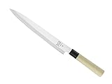 Sword making history in Japan dates back over 1,000 years, when master swordsmiths practiced their craft making weapons for warriors. Modern Japanese kitchen knives are a descendant of these renowned swords, as evidenced in the details, ideals, and spirit that have been passed down through generations that go into each tool. This particular knife has a deba shape. It is the tool of choice when filleting a whole fish. The thick spine and one-sided beveled edge make it easy to process a whole fish, from removing the head and cutting through bones, to slicing fillets. Stainless steel, designed for left-handed users.