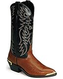 Affordably priced lizard print cowboy boots make an impression This Laredo western boot features a genuine leather foot topped with a 13" contrasting manmade shaft. Narrow toe and cowboy heel. Smooth manmade sole. EW, Extra Wide, equals EE width.