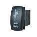 20 Amp 12 Volt ON-OFF Rocker Switch LASER ETCHED WITH TWO L.E.D. LIGHTS Single Pole Single Throw ON-OFF Switch. Black hard surface rocker. Surface size is 2" (50mm) x 1"(25mm). Standard size mounting hole 1.41"(36mm) x .86"(22mm). This is the standard size of most switch holes in modern vehicles. Upper light is ON when the switch is pressed UP. Lower LED is independent and can be wired to separate dash light circuit. Both LEDs have separate grounds. No rear barriers between terminals. Lower light Waterproof rating of IP66. All symbols are laser etched directly onto the switch face to ensure long image life.