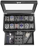 BEWISHOME Watch Box for Men, 12-Slot Watch Case with Drawer, 2-Layer Mens Jewelry Box with Large Glass Lid, Watch Display Case Watch Holder Organizer Watch Storage for Men Women Black, SSH02L