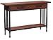 The Ironcraft Two Drawer Sofa Table blends the familiar with something fresh and new. It features rich, wood tones over matte black steel bases. The sofa table features storage inside two drawers and a lower storage shelf. The traditional mission slats are echoed in a contemporary, two-piece custom drawer pull. Solid wood drawer boxes open completely on ball-bearing roller guides for easy use. It is finished in Burnished Medium Oak and is easy to assemble.