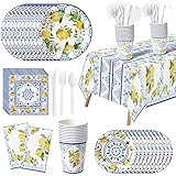 G1ngtar 170Pcs Capri Lemon Party Supplies - Blue Tiles Yellow Lemon Party Tableware Decorations Summer Citrus Fruit Disposable Paper Plate Cup Tablecloth Napkin for Kid Birthday Baby Shower, Serves 24