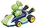 - Featuring your favorite Mario Kart characters Mario and Yoshi driving around the track at fast speeds