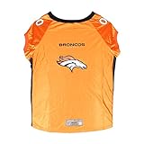 Your dog will dream of chasing footballs in this premium pet jersey by Littlearth Productions. Our jerseys give that NFL uniform look with the details on the collar and sleeves. The dazzle fabric and mesh along with the colorful team logo screen print will keep your dog game day ready and the best dressed pooch at the tailgate. The front of the collar has a woven NFL shield and the back bottom of the jersey has a woven jock tag. Made of 100% polyester and machine washable.