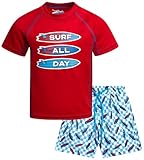 Beach Bros. Boys Rash Guard Swimsuit Set - UPF 30+ Kids Short Sleeve Bathing Suit Swimwear Sets (Sizes: 5-14), Size 14, Red Surf All Day