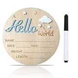 Baby Announcement Sign, 5.9 Inch Wooden Hello World Newborn Signs, Birth Announcement Sign, Cloud and Stars Decoration, Welcome Newborn Arrival To World, Hospital Nursery for Baby