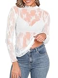 Askyes Womens Long Sleeve Sheer Mesh Top with Mock Neck Lace Floral See Through Sexy Y2k Style Blouses White L