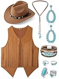 Suhine 9 Pack Western Outfits for Women Cowgirl Fringe Vest Boho Cowboy Hat Turquoise Jewelry Kit for Halloween Costume(Large,Khaki)