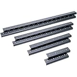 Rack rail in pre-cut, standard 8 space (8U) rack length. Perfect for building your own rack cabinet. 1/8" thick heavy duty steel rail with tapped 10/32" holes. Black powder coat finish. Standard rack 1/2" and 1-1/4" o.c. alignment. 14" in length. Sold in pairs. Mfg. #R0821/8.