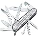 Swiss army knife Victorinox Huntsman with 15 functions. - - Brand : Victorinox - Model : Huntsman 1.3713.T7 - Color : silver transparent - Length : 91 mm (3,58 inch.) - Width : 21 mm (0,83 inch.) - Weight : 97 g (0,21 Ib) - - 15 Functions : - 1. Blade, large - 2. Blade, small - 3. Wood saw - 4. Corkscrew - 5. Scissors - 6. Can opener with - 7. - screwdriver 3 mm - 8. Cap lifter with - 9. - screwdriver 5 mm - 10. - Wire stripper - 11. Reamer, punch and sewing awl - 12. Multi purpose hook - 13. Tweezers - 14. Toothpick - 15. Key ring - -