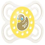 For the big kids among the little ones. The MAM Perfect 6 plus month pacifier was designed with baby in mind, by orthodontists and pediatric dentists, to reduce the risk of misaligned teeth. The Mam Perfect with Dento Flex has a nipple neck that is 60 % thinner and a nipple that is 3 times softer than other silicone pacifiers. The Mam Perfect adapts itself without harmful effort on baby's part and leaves enough room for healthy dental development. The 6 plus month pacifier is good for baby's skin thanks to its large air holes and MAMs patented inside surface. The shield of the 6 plus months pacifier is larger and rounder than the rest of the pacifier line ensuring maximum comfort. Like the rest of our pacifier line, the MAM 6 plus month pacifier is orthodontically correct and has a symmetrical nipple. BPA free for baby's 6 plus months. Green.