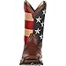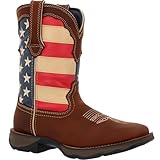 Durango Kids Patriotic Western Boots To make this Lil' Durango kid's boot as adorable as it could be, the upper of this Western boots was made with synthetic leather and an exuberant-looking flag shaft. Selecting a children's boot with man-made materials is a fantastically wise decision; it looks and feels like the real thing, but your child will be able to wear these boots here, there and everywhere and you won't be concerned about the fabric getting damaged. Plus, it makes cleaning these kid's boots such an easy process. These Lil' Durango boots have a dipped topline and pull tabs; these are great features because it allows your child to get these boots on/off without any difficulty. These Western boots were made with a traditional looking and comfortable square toe. They also have a decorative toe bug stitch on the foot and a double row of welt stitching that enhances the footwear's durability. Product Features: It is made with synthetic leather and features an enthusiastic looking flag shaft. It offers great traction and comfort. Works as an extremely stylish and comfortable footwear. Item Specifications: Color: Brown/Flag Material: Synthetic leather with union flag Outsole: Lil' Durango non-marking Insole: Cushion flex Heel Type: Rocker Heel Height: 1 1/8In Toe: Square Shank: Tempered steel Shank Area: Rolled Shaft Lining: Soft mesh Stitch: Double row welt