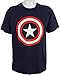 Navy shirt with Captain America symbol, 100% cotton, front image. Standard men's size tee;Large front print design;Features Captain America's shield logo