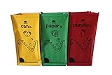 Welcome to Recycling Rules! We are a 501(c)(3) nonprofit organization dedicated to helping you start or enhance a recycling program. This recycling bin is a customer favorite and is our best-selling bin. It's perfect for collecting recyclables in a kitchen and fits nicely under most sinks, in a utility room, a garage or by a desk. When full its sturdy handle makes it easy to carry to a central recycling dumpster or to take to your recycling center. Many apt. and condo residents find this bin a must. Great for schools, offices, and churches too! Its nontraditional shape helps keep trash out and recycling in. Watch your recycling participation rate soar. An ingenious design allows the handle to fold down and allows multiple bins to stack, one on top of another. Perfect for those environments where recyclables still need to be separated. You can create a "recycling tower" for glass, metal, aluminum, plastic, paper, plastic bags, Styrofoam„, batteries, etc. Made in North America with a minimum of 35% recycled content. Bin measures 13.5" tall (handle folded down), 10.5" wide and 14.25" deep. Measure carefully! Capacity is 6 gallons (assuming that it could hold water up to the top). Your order will contain three (3) identical recycling bins, shipped nested in the box. See our 4-pack, 6-pack, 10-pack and 21-pack listings for even greater savings per bin!