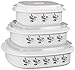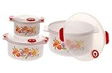Reston Lloyd is a leading manufacturer and distributor of kitchenware, specializing in enamel on steel products. For nearly 30 years, they have been dedicated to providing the highest quality products, with an equal emphasis on superior customer service. Reston Lloyd provides a wide variety of household goods that coordinate with patterns of popular dinnerware manufacturers. The 6-piece microwave cookware set allows you to prepare a meal from freezer to microwave to dishwasher using only one container. Cook a meal, store the left overs or use as a lunch container. Each set comes with 3 containers with 3 lids that features an adjustable stem vent. Each container is decorated with a popular Corelle pattern to match with your dinnerware or kitchen decor. Each set nests together with the lids to minimalize storage space. BPA free. Dishwasher safe. Measures 16 oz., 6 1/4"L x 5 1/4"W x 2"H, 28 oz., 7 1/2"L x 6 1/4"W x 2"H, 40 oz., 8 1/2"L x 7 3/4"W x 2"H.