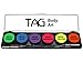 TAG Neon Face Paint Palette comes with 6 colors (Neon Green, Neon Blue, Neon Purple, Neon Magenta, Neon Yellow and Neon Orange) in 10 gram containers. Also included is two face painting brushes: one flat and one round. TAG Neon Face Paints pop out under black light and great for special effects. During the day, TAGs Neons are colorful and bright under normal light. TAG Face Paint is very easy to blend, soft on the skin and does not crack or peel. Most of TAGs face painting colors are great for line work and lighter face painting colors show very well even when over darker colors. TAG facepaint has a wax base, so your face painting design flexes with movement instead of cracking, remains colorful and is comfortable to wear. TAG is a very soft creamy face paint and needs less water to activate than normal face paint. TAG face paint is hypoallergenic and made with non-toxic, skin safe ingredients. Each 6 color TAG Face Paint Palette is good for 50-200 applications.
