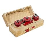 Make cove raised panel cabinet doors with this 3 bit professional router bit set. Use with up to 1" stock. Rail and stile bits create a perfectly matched rail & stile door frame. The raised panel bit puts a classic cove edge on the central panel of your door. The panel raiser bit can also be used to make attractive drawer fronts, table tops, plaques and moldings. Fully enclosed ball bearing guides allow for precise cuts without the use of a fence. Two flute carbide cutters & 1/2" shanks. Set comes in a solid wood storage case.