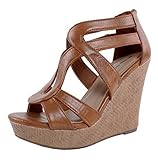 JJF Shoes Lindy-3 Tan Strappy Nubuck PU Comfort Gladiator Dress Platform High Wedge Sandals-7