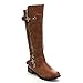 These stylish yet comfortable knee-high riding boots featuring a round toe, back quilted design, dual decorative zipper/buckle gold strap, and stitching details. Finished with slightly cushioned insole, soft interior lining keeps you warm and comfy, full size side zipper closure for easy on/off. Product by Forever.