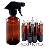 8oz and 10ml (1+6) Spray and Roller Bottle Set, Empty Refillable Amber Glass Bottles, Stainless Steel Roll On Balls, Mist & Streaming Sprayer, for EO, Kitchen, DIY Cleaning or Mosquito Repellent