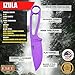 Type: neck knives; overall: 6.25"; blade: 2.5" L 1095 carbon steel L standard edge L powder coated finish; handle: Purple L carbon steel; other info: one piece skeletonized construction. Molded sheath with clip plate. Boxed.