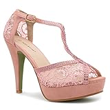Top Moda Womens Hy5 Formal Evening Party Lace Ankle T-Strap Peep Toe Stiletto High Heel Pumps,Blush,8