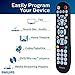 Settle in for the night with the Philips 4 Device Universal Remote. You'll no longer need to worry about keeping track of multiple controllers - the remote is designed to control 4 separate devices, including your TV, video streaming media player, Blu-ray player, cable, satellite and more. Eliminate the hassle of programming more than one controller and enjoy the simple, user friendly setup of the universal remote. Enhance and simplify your home entertainment system by customizing the remote's capabilities to give you the best experience possible. The universal remote also features Primary Audio Control, allowing you to raise or lower the volume regardless of which device you're operating. For added convenience, the remote includes a DVD/Blu-ray player open/close button as well as advanced DVR functions, simple menu navigation, a dash button for sub-channel access and a one-touch streaming button to take you straight to media platforms on your devices. The remote comes in a glossed black finish with easy to see big buttons. It requires 2 AAA batteries (not included). Make the Philips 4-Device Universal remote the center of your home entertainment system.