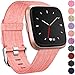 <b> Material:</b><p>Premium fabric woven</p><p>Stainless steel buckle and spring pins</p><br><p><b>Compatible Devices: </b></p><p>Fitbit Versa Fitness Smartwatch</p><br><p><b>Package: </b></p><p>1 * Replacement Band ( Fitbit Versa is NOT included.) </p><br><p><b>Optional Size: </b></p><p>Small suitable for 5.2"-6.7" wrist</p><p>Large suitable for 6.3"-7.8" wrist</p><br><p><b>Multiple Colors: </b> </p><p>Lavender, Charcoal, Black, Blue, Red, Orange, Pink, Orange Pattern, Rose Pattern, Rainbow Pattern</p><br><p><b>One-year Warranty: </b></p><p>Every purchase is backed with 100% Satisfaction Guarantee. </p><p>If you received defective items or had any problems, please feel free to contact us. </p><p>We take care of you with free replacement or full refund immediately. </p><br><b>Kindly Reminder: </b></p><p>1. The strap might feel a little stiff at first but it will soften up as continual wear. </p><p>2. Due to not water resistant, the wristband will get wet and dirty after intense workouts or under water activities. </p><p>Â It is recommended you wear it for everything and should wear it for special occasions instead of daily exercise.</p><p>3. You need clean and maintain to keep your band for long. </p><p>Â The band had better dry naturally after wiping or hand washing in cold water. </p><p>Â Direct sunlight, iron and humidity might affect the service life.</p>