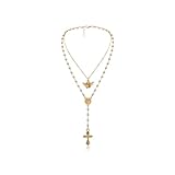 Gold Layered Necklace for Women, Cross Y-shaped Necklace Angel Wings Pendant Necklace White Pearl Bbead Necklace Cherub Charm Necklace Adjustable (Gold)