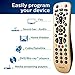 - STYLISH FINISH AND ERGONOMIC DESIGN – This universal remote’s brushed gold finish adds a touch of elegance to any décor while its compact designs fits comfortable in hand