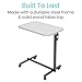 SLEEK DURABLE DESIGN: Constructed with a steel base, easy to maneuver swivel wheels and a strong tabletop, the Vive compact overbed table is exceptionally durable and safely supports up to 22 pounds. The overbed table also features a slightly raised edge to prevent items from sliding off.