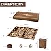 Size: The premium backgammon board's open dimensions are 20.5 x 16.5 x 1.1 inches, the closed dimensions are 16.5 x 10.25 x 2.2 inches, and the backgammon piece's dimension is 1.1 inches