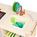 26-Piece Set: This kitchen comes with an oven, stovetop, sink, dish rack, a chalkboard, storage, dishtowel hanger, cookware, dishes, cutlery, and utensils.