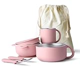 Bakpoco Kids Dinnerware Set - 6 Piese Toddler Plates and Suction Bowls Set with Kids Utensils&Cup, 2 IN 1 Stainless Steel & Silicone Baby Self Feeding Supplies, Blush
